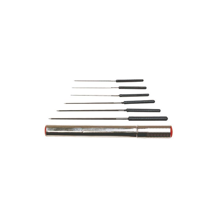 Strumenti professionali per la pulizia e la manutenzione di getti carburatore, ideali per rimuovere incrostazioni dai fori di piccolo diametro.